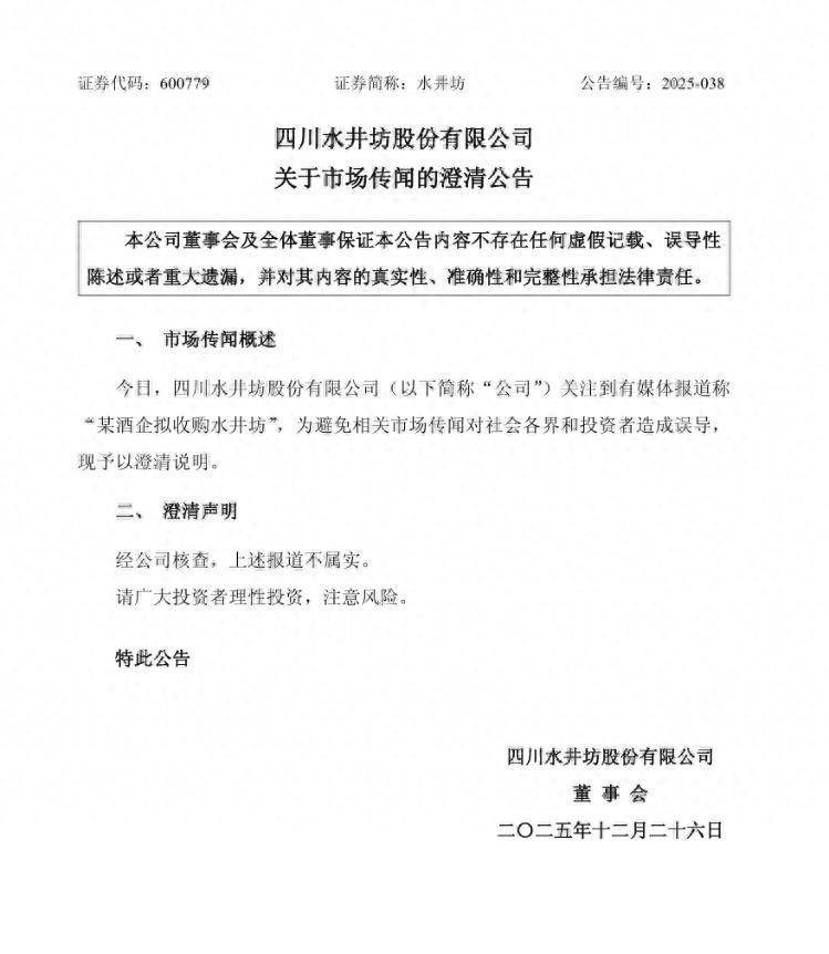 12月25日晚,四川水井坊股份有限公司(简称“水井坊”)发布公告称,关注到有媒体报道称“某酒企拟收购水井坊”,经公司核查,上述报道不属实。